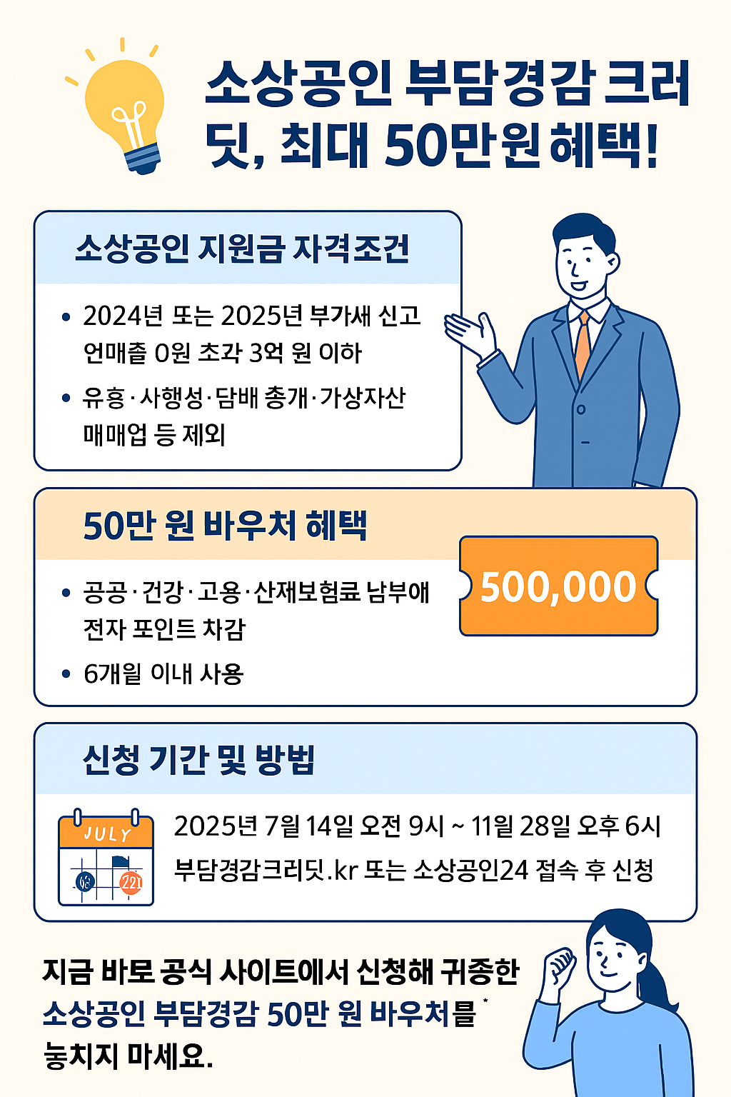 이제도는특히소규모음식점,편의점,미용실등운영비지출이많은업종에서큰도움을줍니다.50만원이라는금액보다매달공과금절약효과가큰것이장점입니다.지금바로공식사이트에서신청해귀중한소상공인부담경감50만원바우처를놓치지마세요.